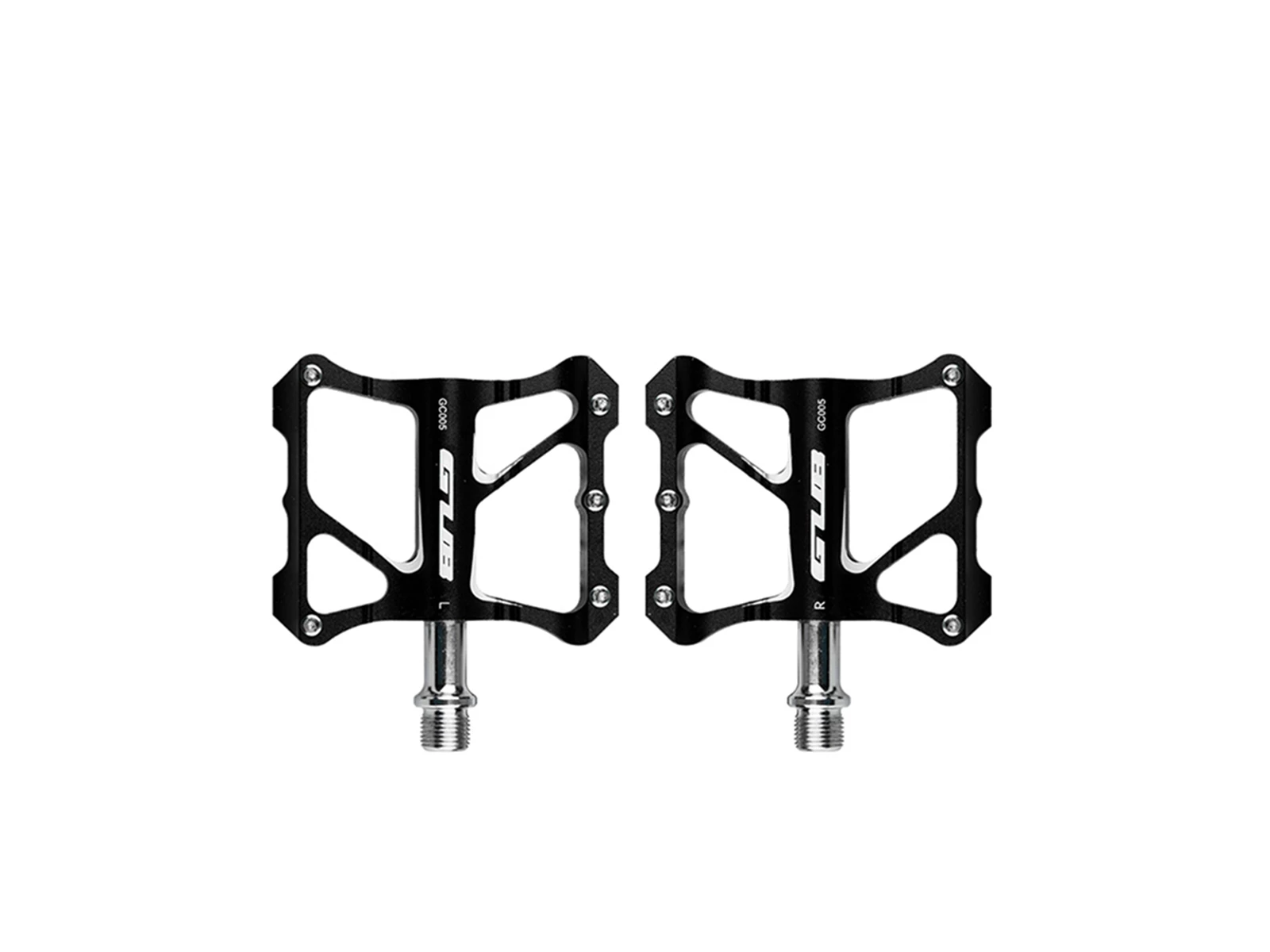 Plattformspedaler från GUB. med 10 stift på varje sida, så att foten fastnar fast vid pedalen och inte glider under användning. Pedalens kropp är tillverkad av en hel bit av slipat aluminium, medan pedalaxeln är tillverkad av värmebehandlat krom och molybdenstål. Molybdenstålet har också stängda och förseglade lager som minimerar friktion under användning. Således ger GUB CG 005 plattformspedaler en stor känsla av kontroll.