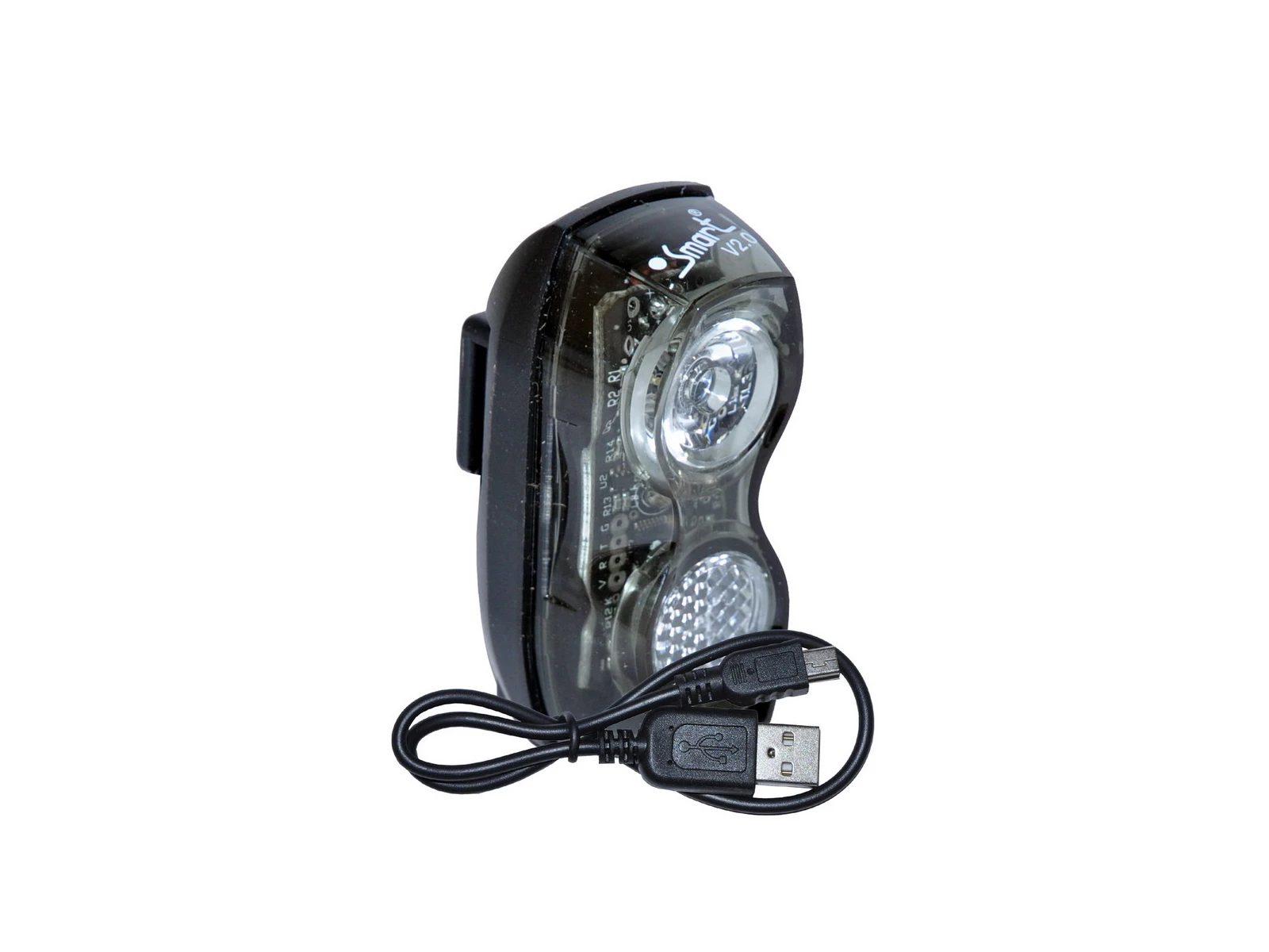Denna framlykta är en Smart Mini USB laddningsbar lykta med reflex och lykthållare. Lykthållaren ska monteras på styret. Lyktan sitter lodrätt på cykeln. Lyktan ger dig 3 ljusmöjligheter: Super Flash, långsamma blinkningar och konstant ljus. Lyktan har den fördelen att den kan laddas upp via USB-kabel som man nästan alltid har tillgång till via datorn eller laddare till mobiltelefoner. När den är uppladdad kan den lysa mellan 5 och 15 timmar, beroende på vilken ljusfunktion som används.